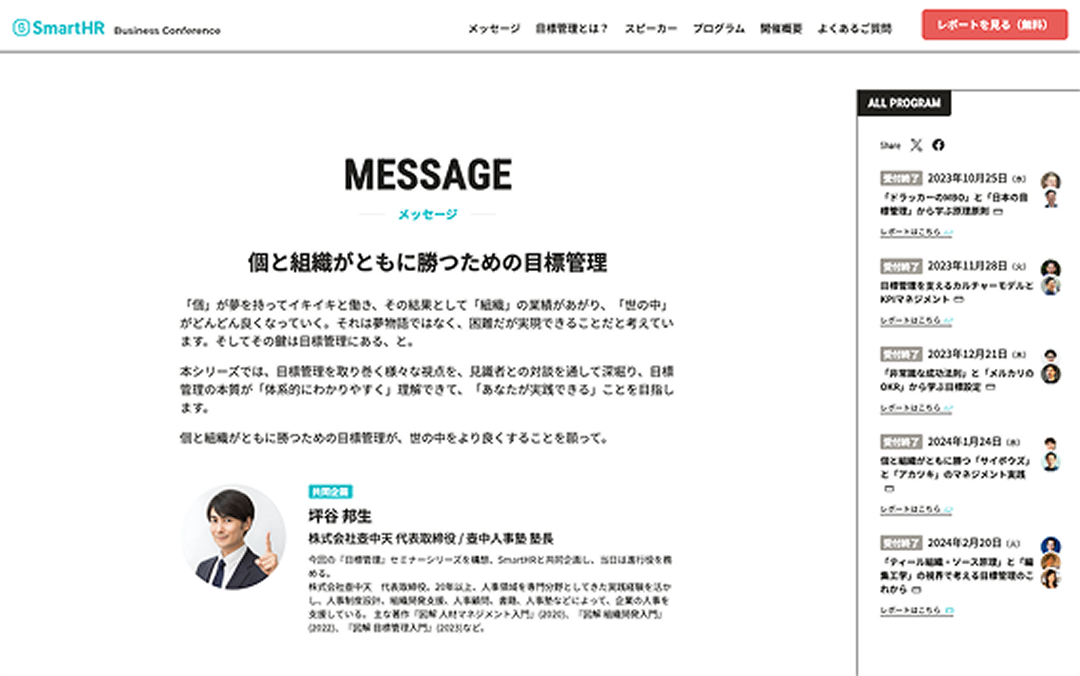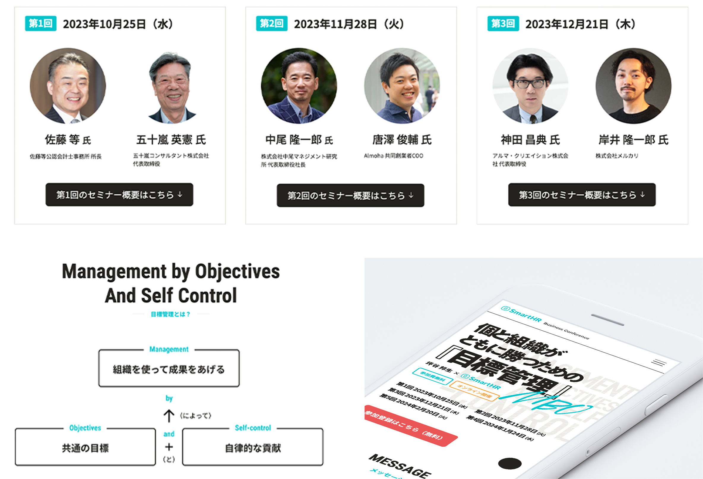 SmartHRが主催するオンラインカンファレンス「個と組織がともに勝つための『目標管理』MBO」のキービジュアル作成、及び、特設サイトの制作を担当しました。