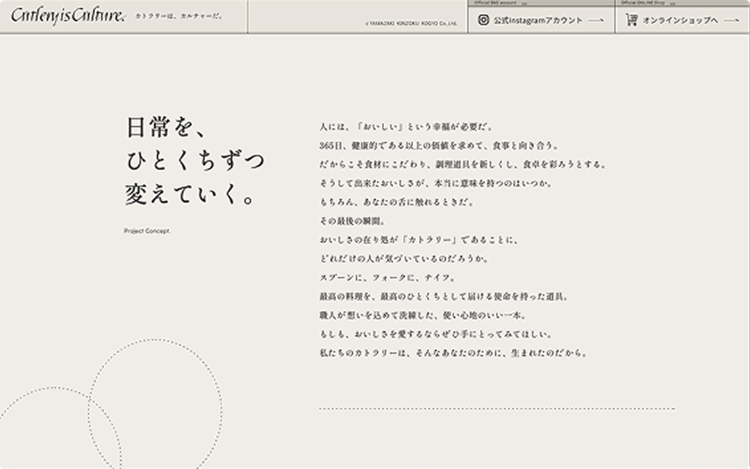 山崎金属工業が掲げる「Cutlery is Culture.」を紹介する、ランディングページの情報設計、デザイン、コーディング、SNSを通した認知拡大施策などのウェブ全般を担当しました。